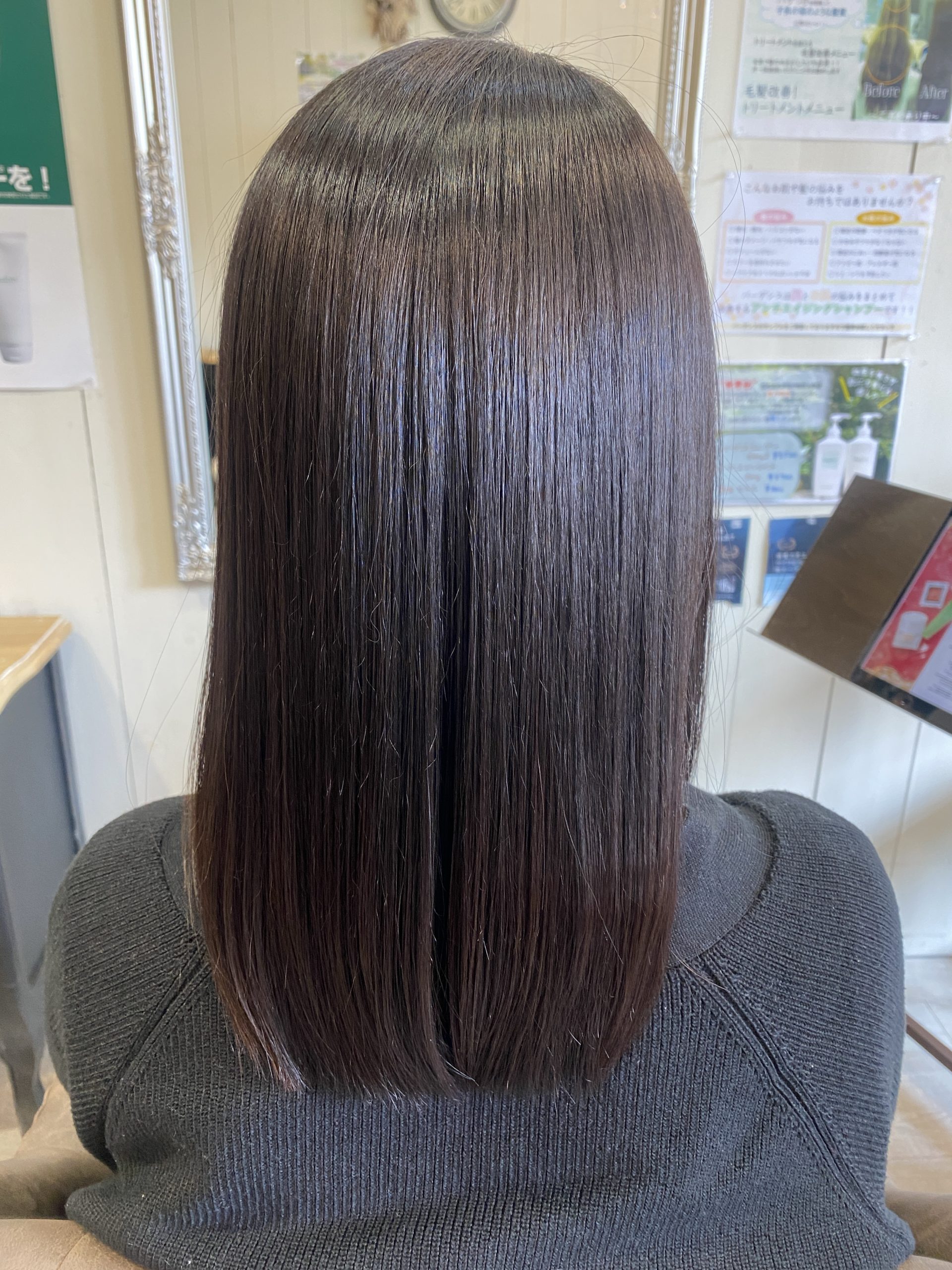 根元の伸びている部分だけ縮毛矯正をして毛先はカットして少し整えてトリートメントをしました。